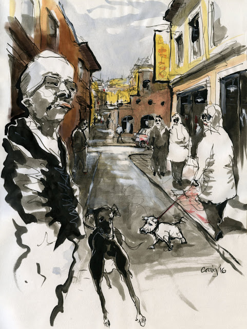 An imagined street scene with two dogs. Ink and gouache on cartridge paper 29x39cm. Practicing a looser style of line and tone for my architectural, urban design and landscape drawings.